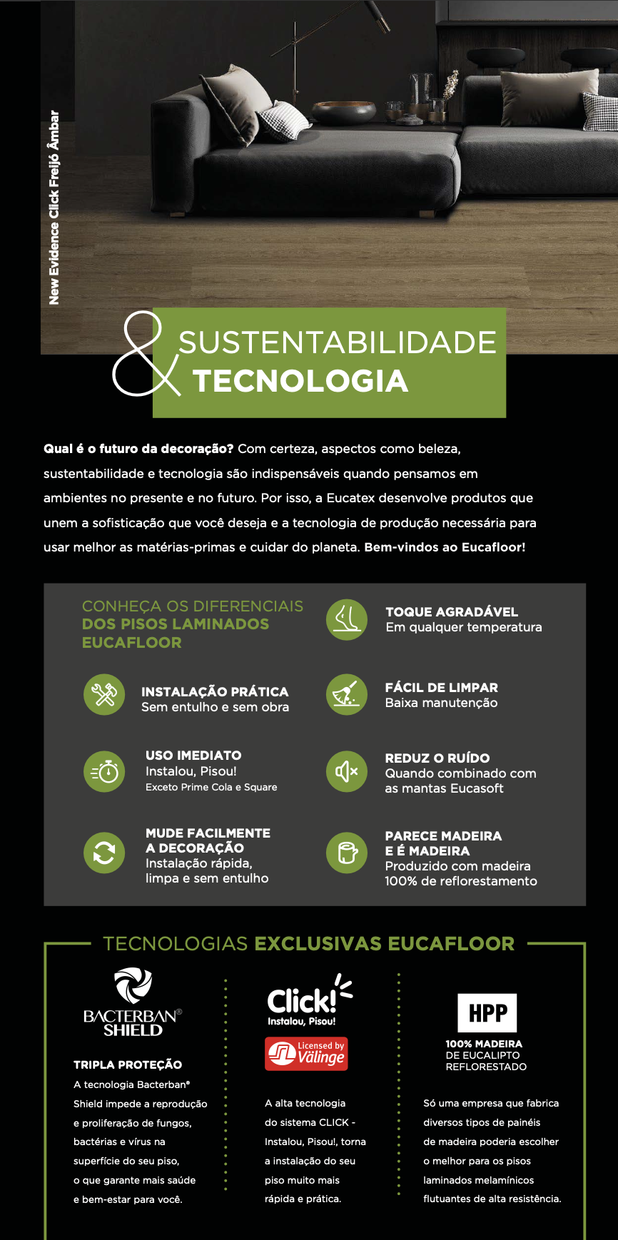 O piso laminado Square Eucafloor é o único piso laminado quadrado disponível no mercado brasileiro, oferecendo um design moderno, elegante e inovador para qualquer ambiente. Ideal para quem busca pisos laminados de grandes formatos, o Square possui placas com 906 x 906 x 8 mm, textura Handscraped (H) que simula o toque natural da madeira ou pedra, e sistema de instalação colado, garantindo perfeita aderência ao contrapiso.