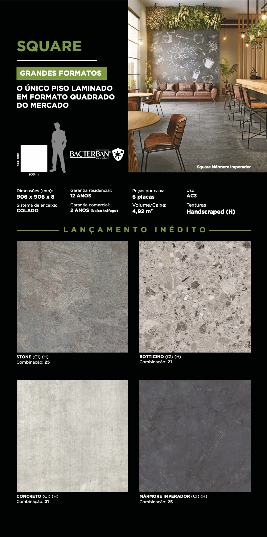 Além de sua estética diferenciada, o Square conta com a tecnologia Bacterban®, que elimina fungos, bactérias e vírus, tornando-se a escolha ideal para quem procura pisos laminados hipoalergênicos, fáceis de limpar e seguros para ambientes residenciais ou comerciais de baixo tráfego.