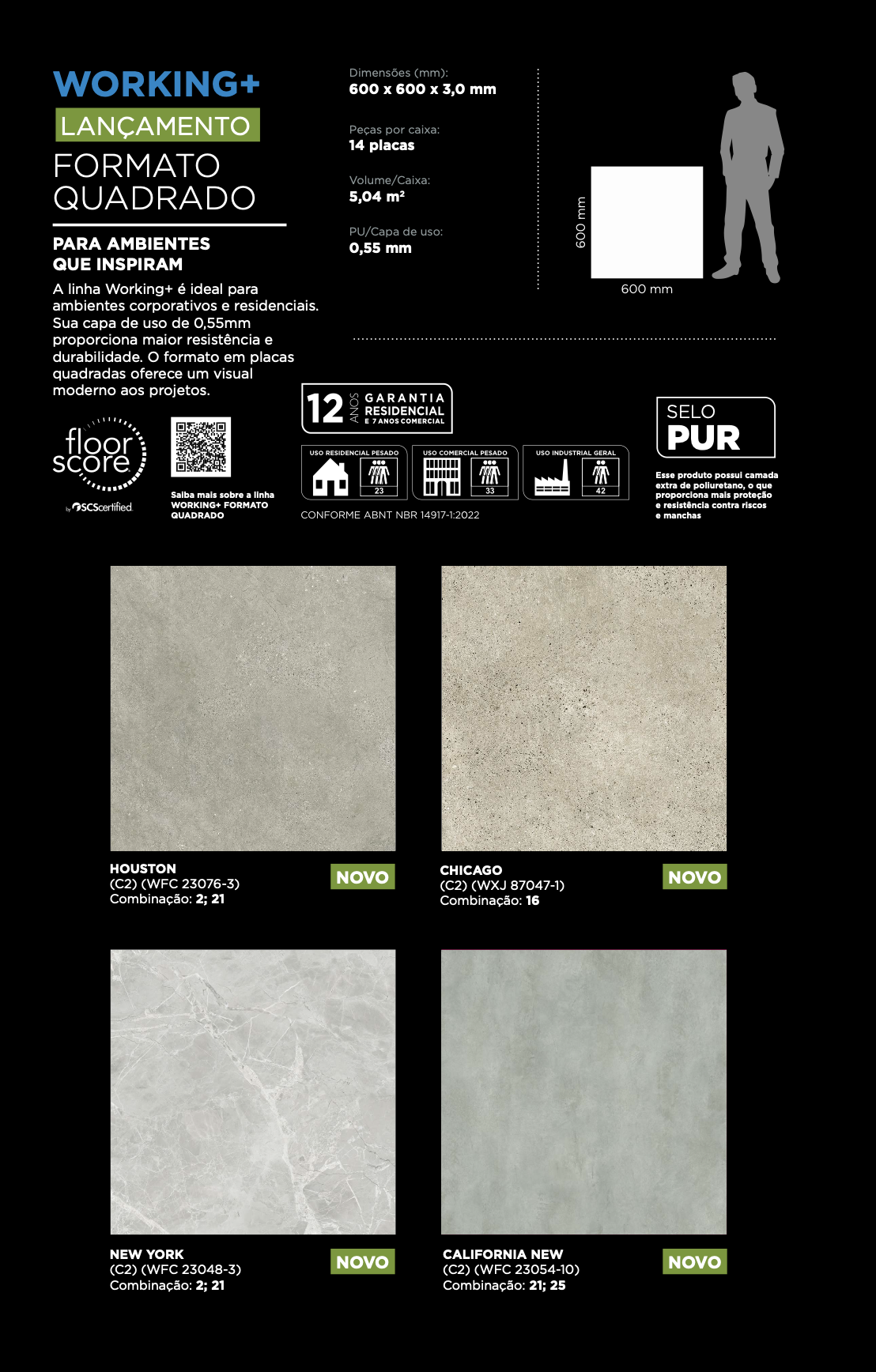 A Linha Working+ Eucafloor foi desenvolvida para ambientes que exigem alta performance, resistência e durabilidade. Com padrão quadrado e visual moderno, ela é ideal para aplicações residenciais e corporativas, oferecendo sofisticação e robustez aos projetos de arquitetura e interiores.