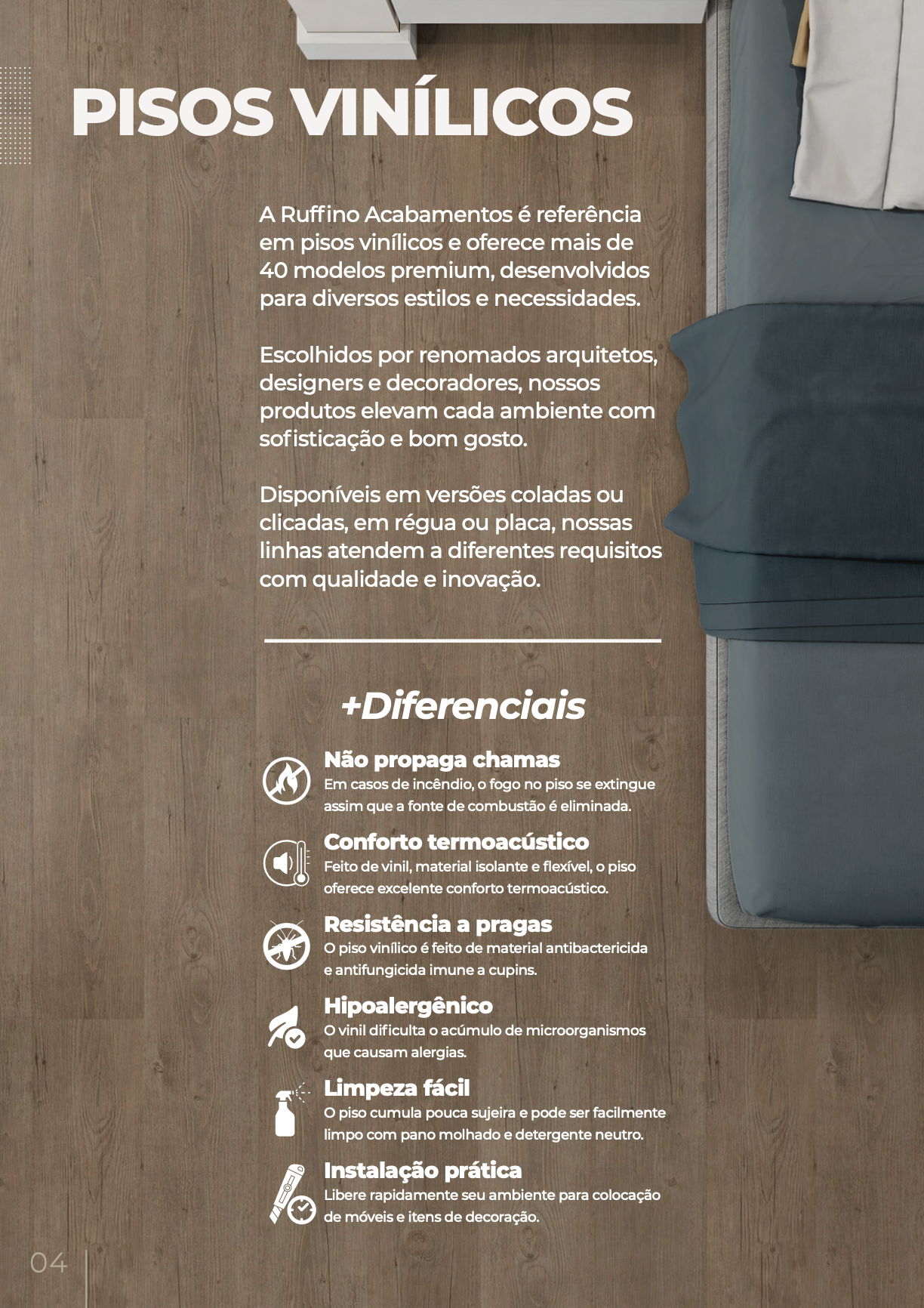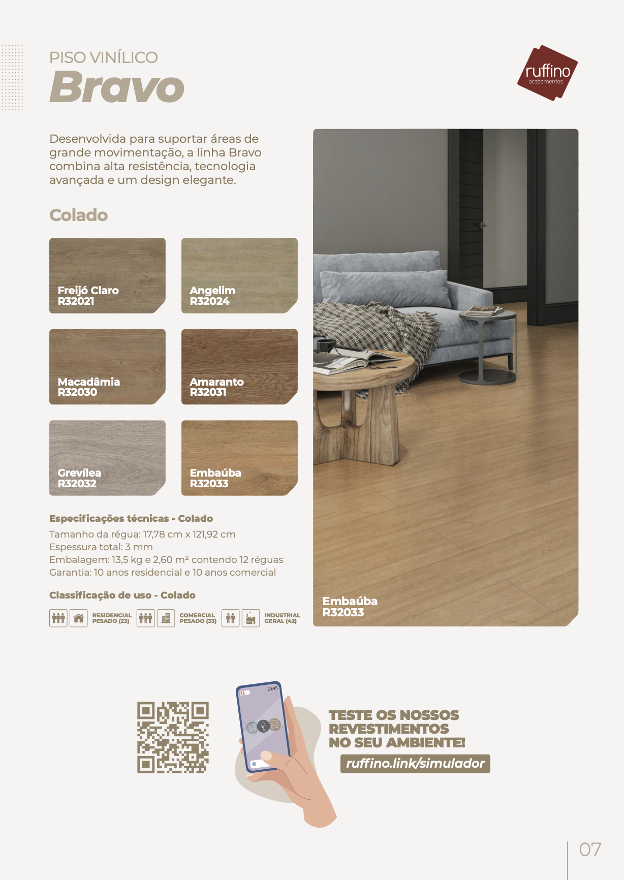 O Piso Vinílico Bravo da Ruffino Acabamentos foi desenvolvido para suportar áreas de grande movimentação, combinando alta resistência, tecnologia avançada e design sofisticado. Ideal para projetos residenciais, comerciais e industriais leves, oferece durabilidade excepcional sem abrir mão da beleza e do conforto.