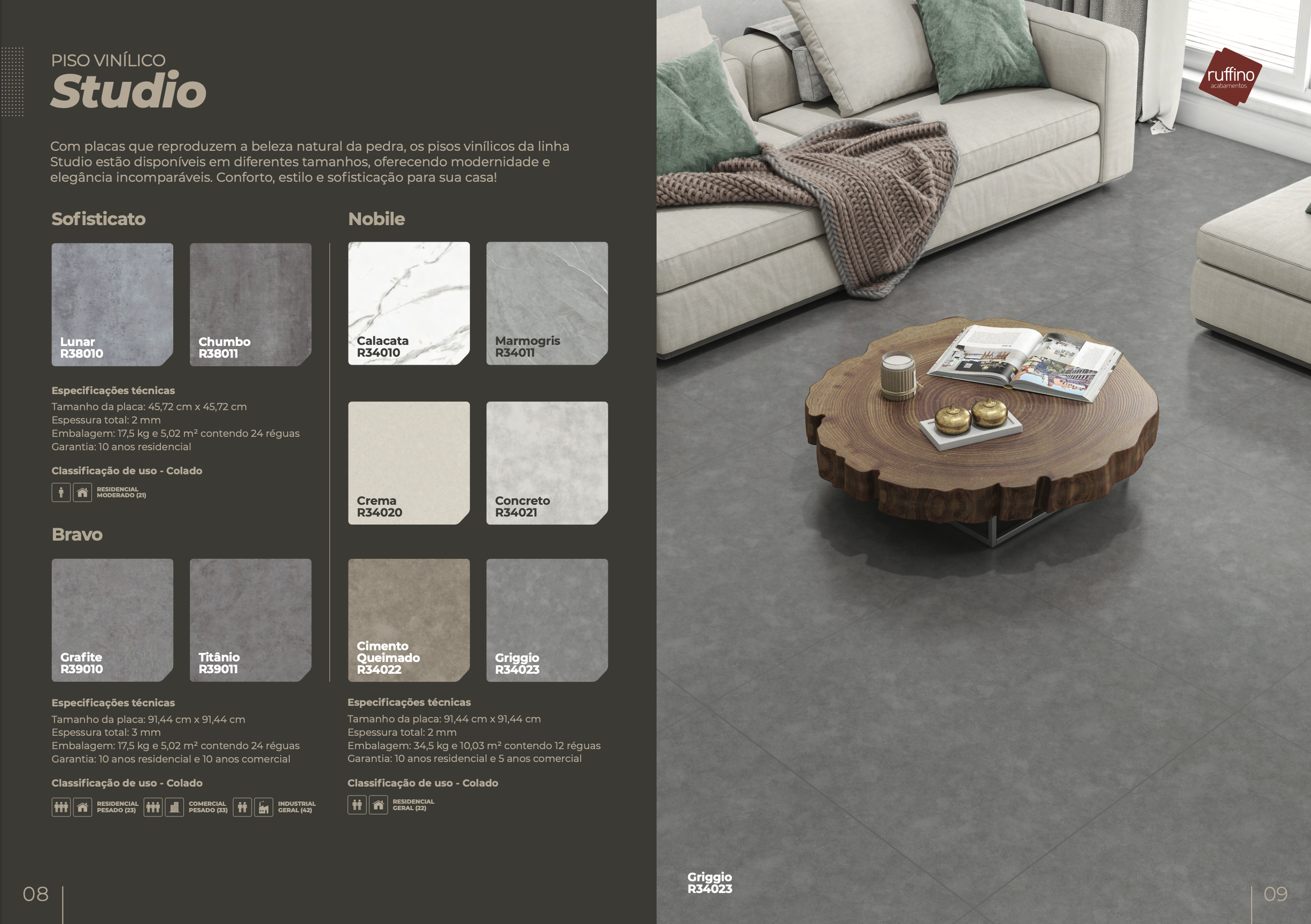 O Piso Vinílico Bravo da Ruffino Acabamentos foi projetado para áreas que exigem alta resistência, sem abrir mão do design elegante. Inspirado na textura das pedras naturais, é ideal para ambientes residenciais, comerciais e industriais leves que necessitam de durabilidade e sofisticação.