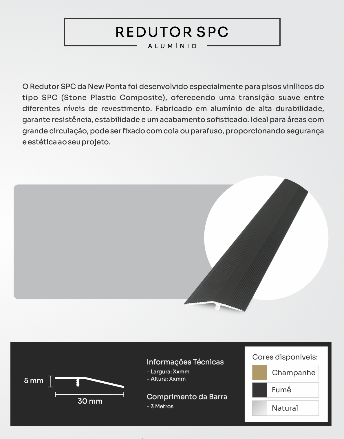 O Redutor SPC de alumínio foi desenvolvido para pisos vinílicos do tipo SPC (Stone Plastic Composite), oferecendo uma transição suave, elegante e segura entre diferentes níveis de revestimento. Fabricado em alumínio de alta durabilidade, é ideal para áreas com grande circulação devido à sua resistência superior, estabilidade e acabamento sofisticado. Pode ser instalado com cola ou parafuso, garantindo segurança e estética ao projeto.